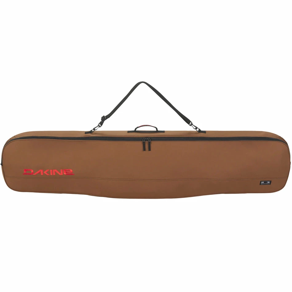 DAKINE PIPE SNOWBOARD BAG The Pipe Snowboard Bag is big on practicality. The full-length zipper makes it easy to load and unload, while a removable strap lets you choose between over-the-shoulder or hand carry. The durable fabric construction protects your board from dings and scratches and, at less than 2 pounds, folds up small and packs away easily when not in use. Limited Lifetime Warranty Padded bottom panel Full length zipper Removable shoulder strap