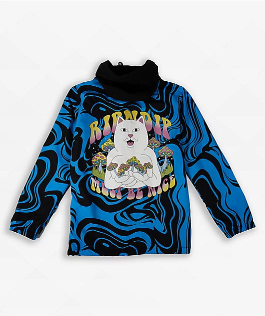 In a black and blue colorway comes the Tasty Treat snowboard jacket from RIPNDIP, featuring a sublimated swirl pattern throughout as well as a graphic of Lord Nermal on the back with a handful of magic mushrooms. Text above and below reads, “RIPNDIP/must be nice” in multicolored text that completes the look. This winter coat features a full zip closure along with a button closure to help keep out any unwanted snow or rain, and comes complete with a warm polyester lined interior and a soft shell hoodie with an adjustable drawstring.