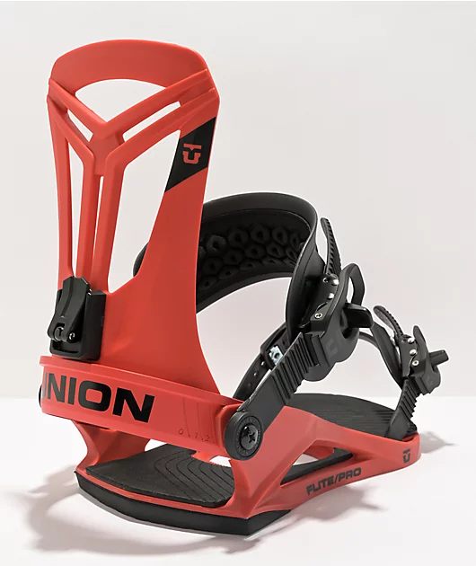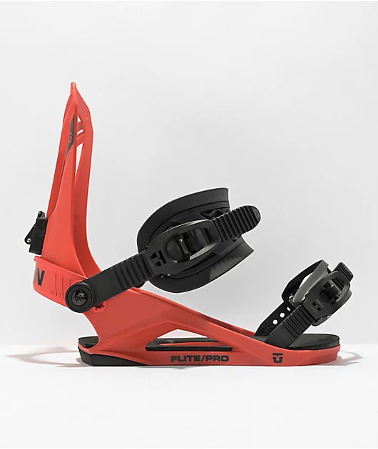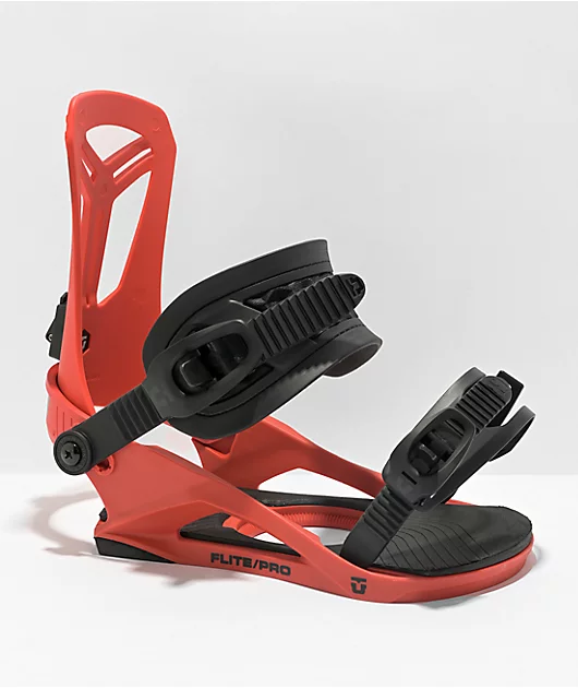 The red Flite Pro 2023 snowboard bindings from Union, made with their lightest baseplate to date and super durable, cold weather-resistant Duraflex highbacks, are perfect for any freestyle rider, from the beginner to the advanced. These Union bindings have a medium to soft flex rating, shock absorptive EVA bushings, and comfortable, secure toe and ankle straps. Finished with the strongest steel hardware on the market and rapid resonse alumium buckles, these snow bindings are sure to impress.
